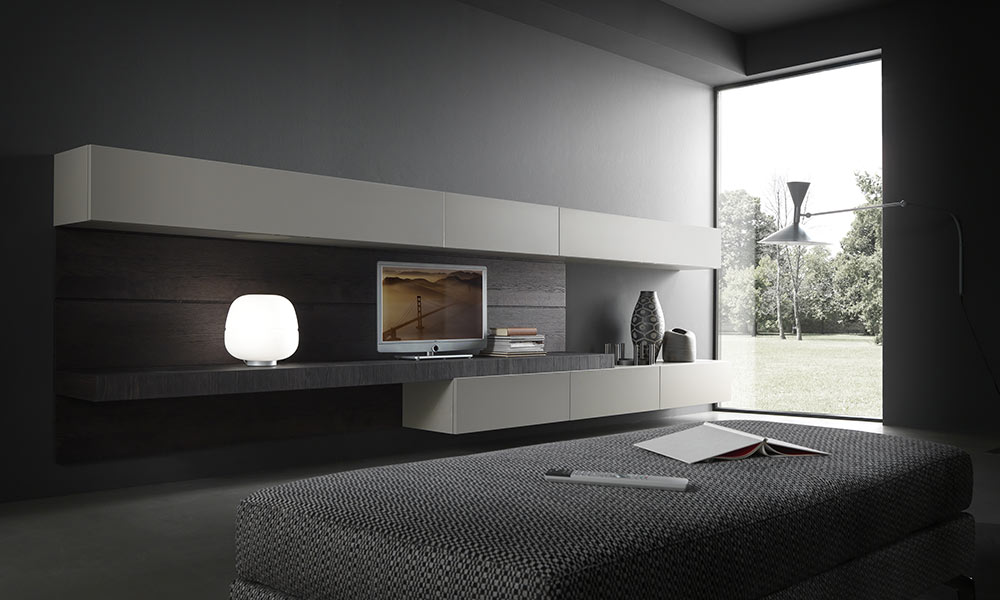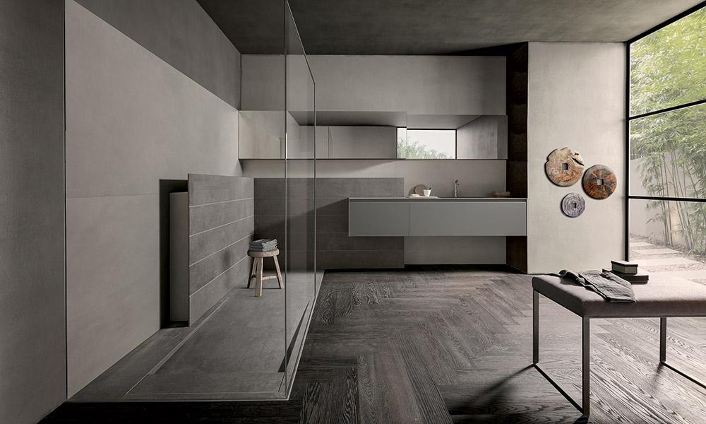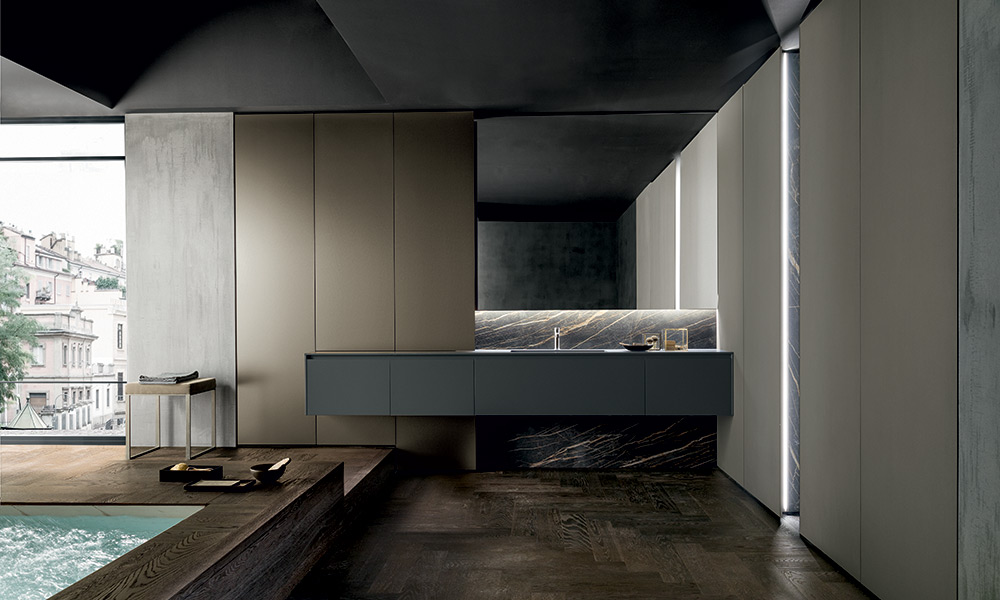 Super Matt Smoke Grey base units and matching laminate top with integrated bathtub in matt white Tecnoril for this Light bathroom solution. The fronts feature a Light metal profile attached to the edge of the door to facilitate grip and opening.